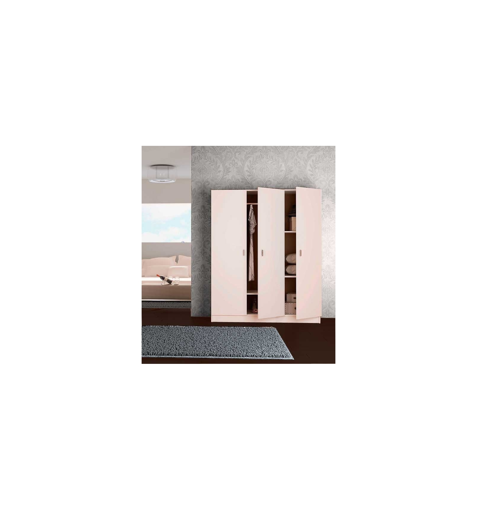 Amplio armario de 3 puertas abatibles que te facilitará organizar y ordenar toda tu ropa, tanto la que uses a diario como la de fuera de temporada. Este práctico armario incluye, por un lado, barra para colgar todas aquellas prendas que no quieres que se arruguen: vestidos, camisas o chaquetas y un estante inferior. Por otro lado, detrás de una de las puertas, encontramos 3 estantes en los que podrás ordenar jerséis, camisetas o resto de complementos como bolsos o cinturones.