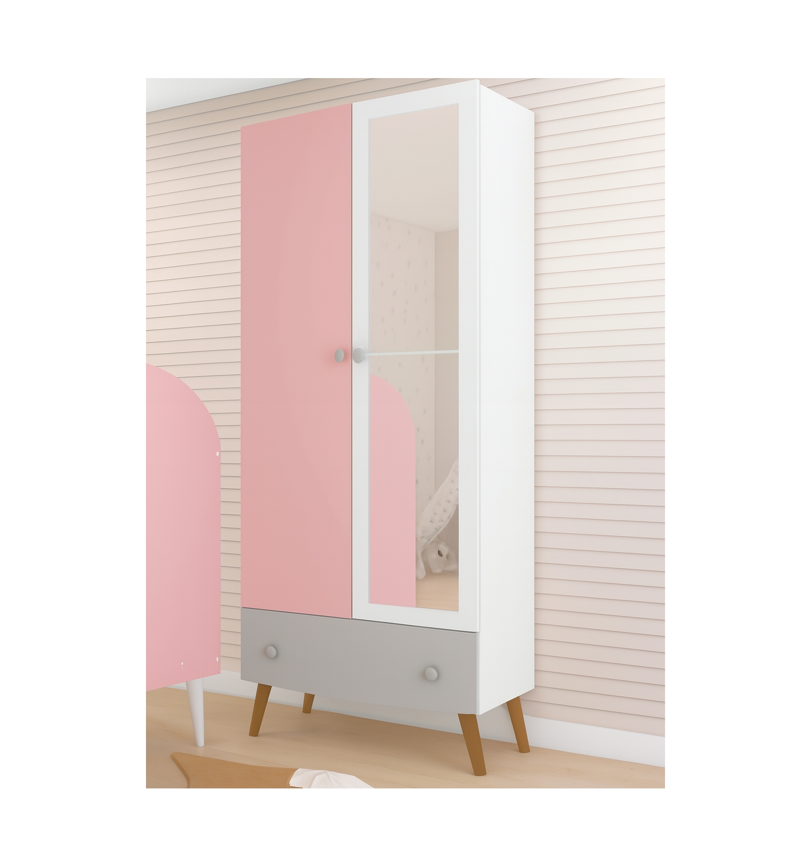 Cuenta con 2 puertas, una de ellas con un práctico espejo integrado, perfecto para que los niños escojan su outfit. En su interior encontrarás una barra colgador metálica, ideal para mantener la ropa perfectamente organizada. Incorpora además un espacioso cajón inferior con guías telescópicas, que garantiza un deslizamiento suave y duradero.