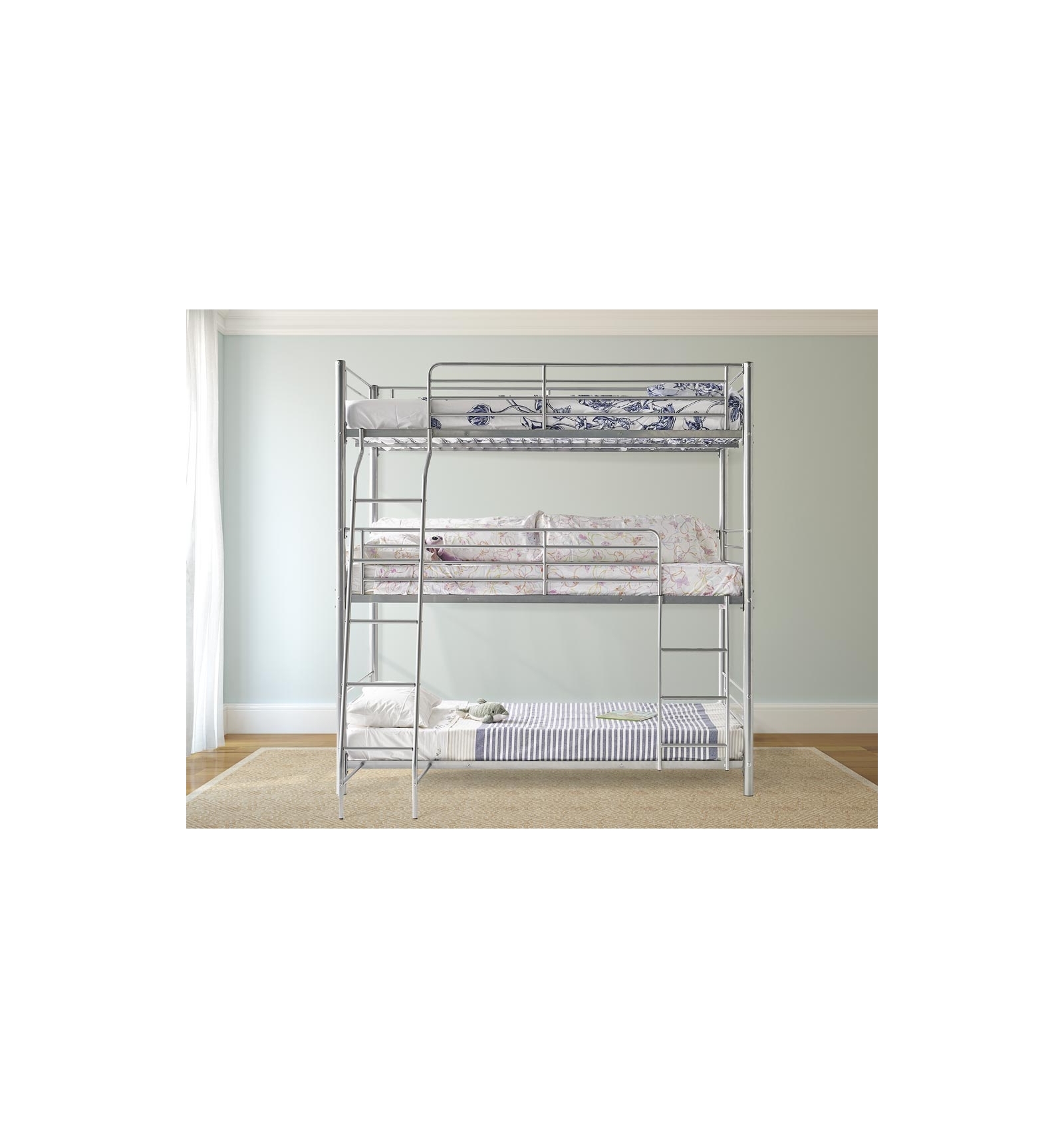 Se trata de una litera triple de estructura metálica muy resistente y estable, con barandillas anti caídas bordeando las dos camas superiores que cumplen los estrictos controles de seguridad.