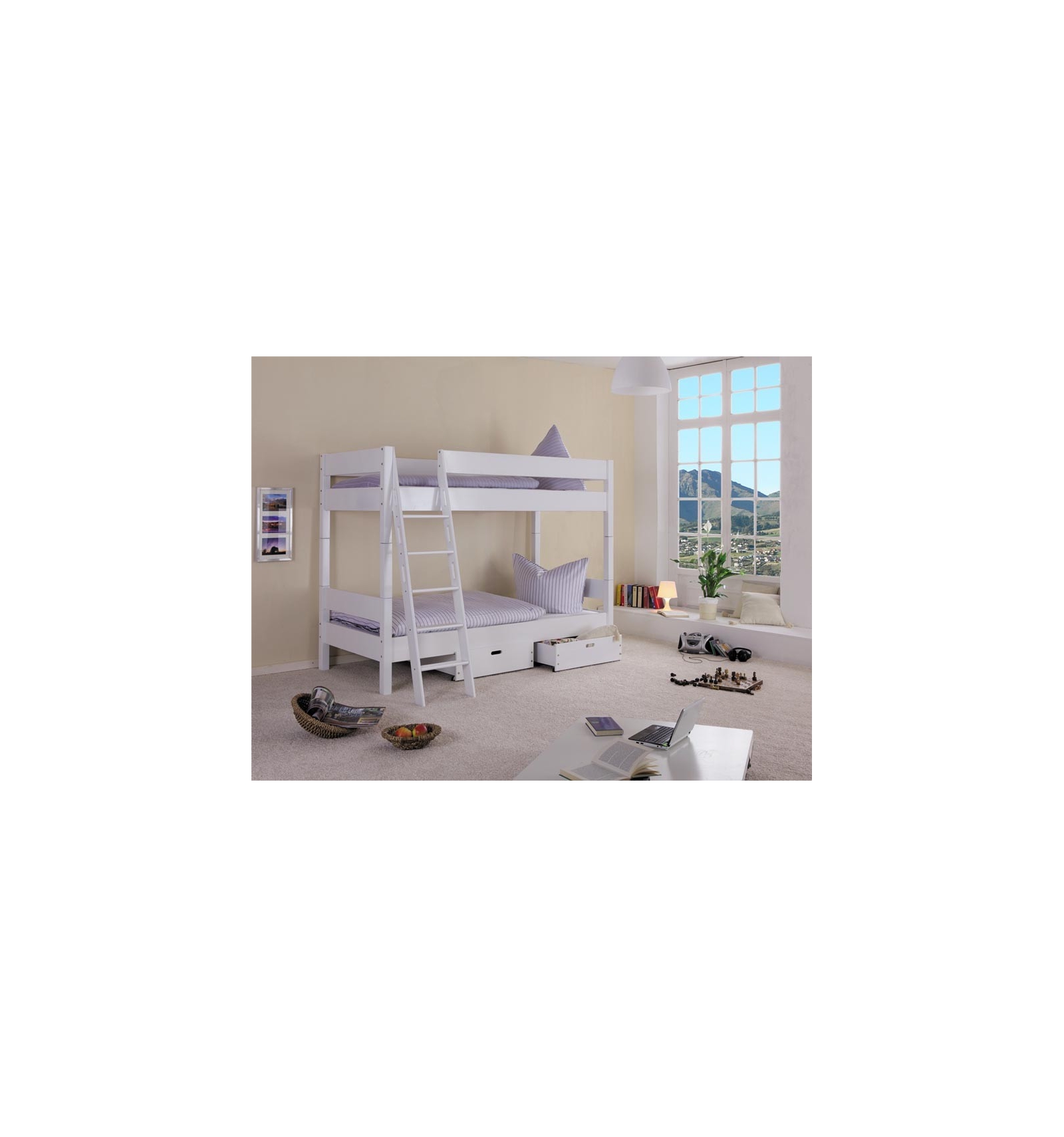 La Litera Vesta transforma la habitación infantil en un espacio moderno, seguro y práctico. Con su diseño de madera maciza de haya y acabado blanco lacado, combina estilo y durabilidad, perfecta para niños y adolescentes.